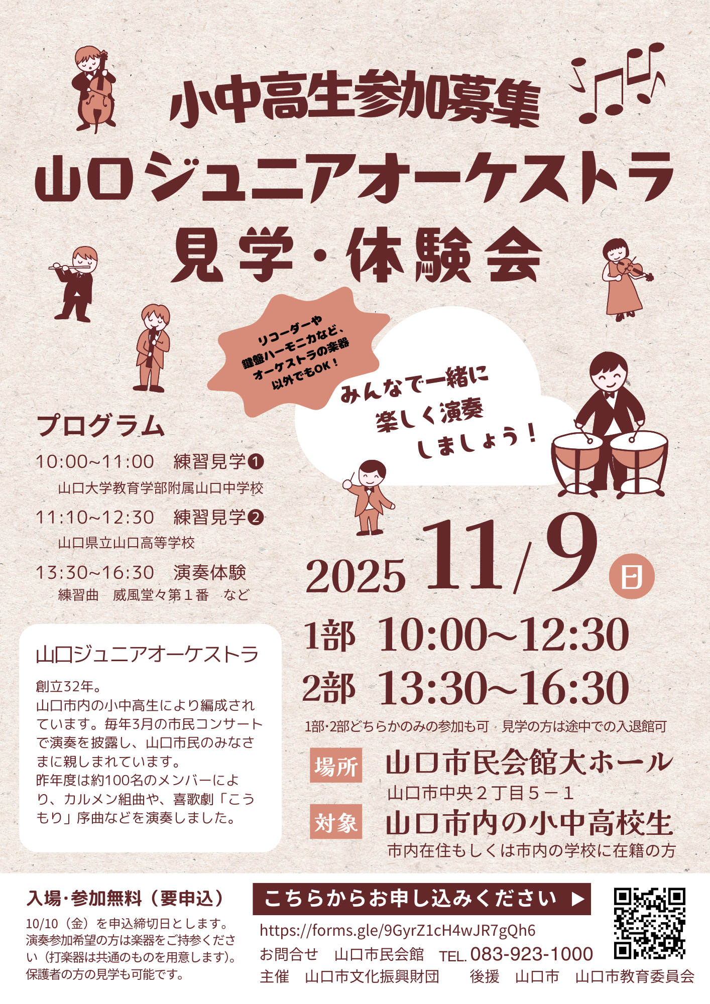 山口ジュニアオーケストラ見学・体験会 日時 2025年11月09日 1部10:00~12:30 2部13:30~16:30 会場 大ホール 料金 無料 ※要申込 お問い合わせ 山口市民会館 083-923-1000