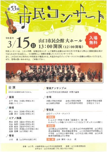 今年度の各種音楽コンクールで優秀な成績を収めた方々をお招きし、その素晴らしい演奏を披露していただくコンサートです。また、この日のために小中高校生で構成された山口ジュニアオーケストラの演奏もあります。